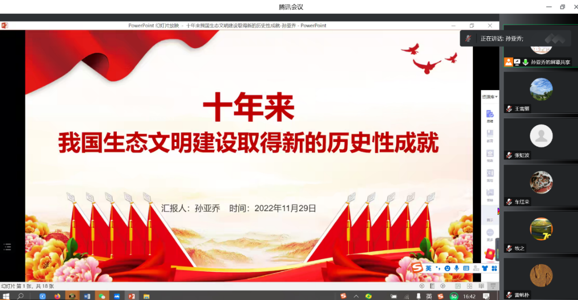 2022年11月29日下午,水资源与环境实验中心党支部通过线上会议的形式开展了“十年来我国生态文明建设取得新的历史性成就”主题党课学习活动。支部全体党员参加了本次会议,会议由支部书记孙亚乔主持。