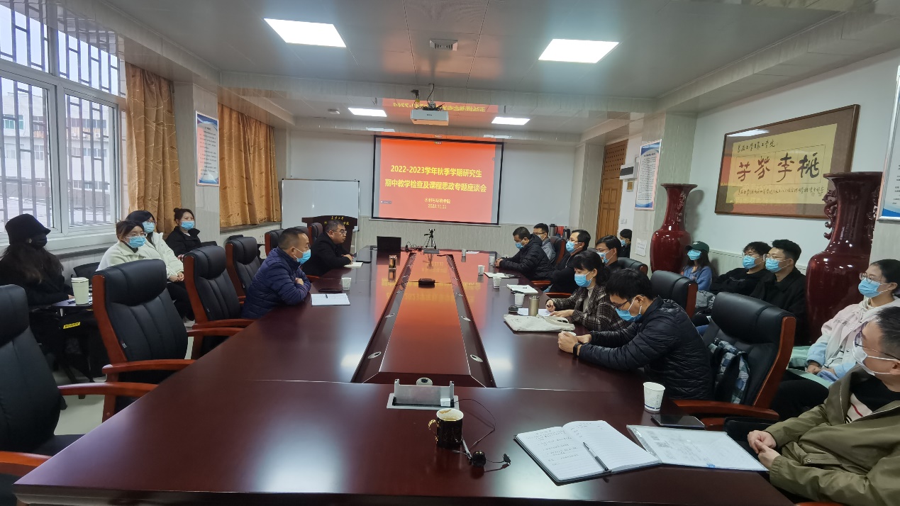 在学院三楼会议室召开2022-2023学年秋季学期研究生期中教学检查及课程思政专题座谈会。学院党委书记邓红章、副书记王妍、副院长段磊、校院两级教学督导及教师代表和学生代表参加,段磊主持会议。