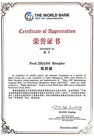 张洪波教授参与的世界银行“中国全球环境基金水资源与水环境综合管理主流化项目(2017-2021,简称GEF主流化项目)”获世界银行及其独立评价局一致评定为“非常满意”项目。