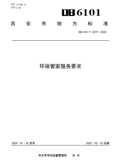 为贯彻落实《中华人民共和国环境保护法》等法律法规,以及《关于积极发挥环境保护作用促进供给侧结构性改革的指导意见》、《关于推进环境污染第三方治理的实施意见》等文件精神,培育及规范全市环保服务,促进环境服务业的发展,根据西安市市场监督管理局《关于征集2023年西安市地方标准制修订项目的通知》(西市监函发[2023] 6号)文件特编制《环保管家服务要求》。西安市市场监督管理局 2025年1月2日批准发布DB6101/T 3219-2025《环保管家服务要求》西安市地方标准,此标准于2025年2月2日开始实施;该标准由西安市环境保护科学研究院主编,小宝影院