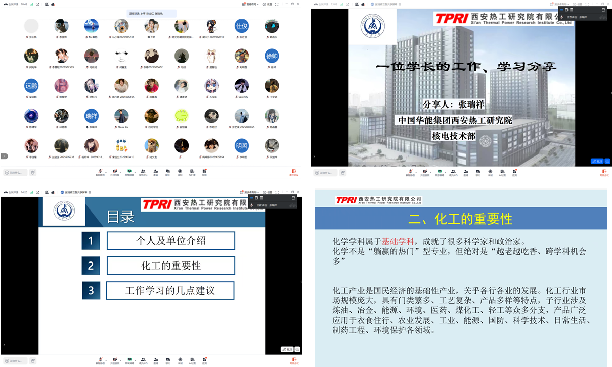 为了让学生对本专业内涵、发展前景有所认识,激发学生对本专业的热爱,举办了优秀校友、行业专家专题讲座。于202618日,有幸邀请到中国华能集团西安热工研究院核电技术部系统优化技术研究所所长 张瑞祥 学长为大家进行了一场题为“一位学长的工作、学习分享”的报告。张老师从“跟人及单位介绍、化工的性、工作学习的建议”三个方面给同学们做了精彩分享,从“衣、食、住、行”简述了化工在生活中的作用,建议同学们“做好规划,有目地的学习;参加一些实践项目,提高专业能力;多关注一些交叉学科和新兴学科,拓宽专业面;注重人工智能与化工专业的结合;提高自身的科研综合能力”,给予了同学们希望,同时也为我们教师提供了一些研究新思路。报告结束,各位老师和同学们分别就未来学习和就业等方面与张老师进行了热烈的讨论。陈志红老师对本次的报告内容进行了总结,并对同学们在未来的学习提出了期望,希望大家能在不断打好基础的同时,积极参与到各种社会实践和科研学习,争取成长为具备较高综合能力的优秀青年。