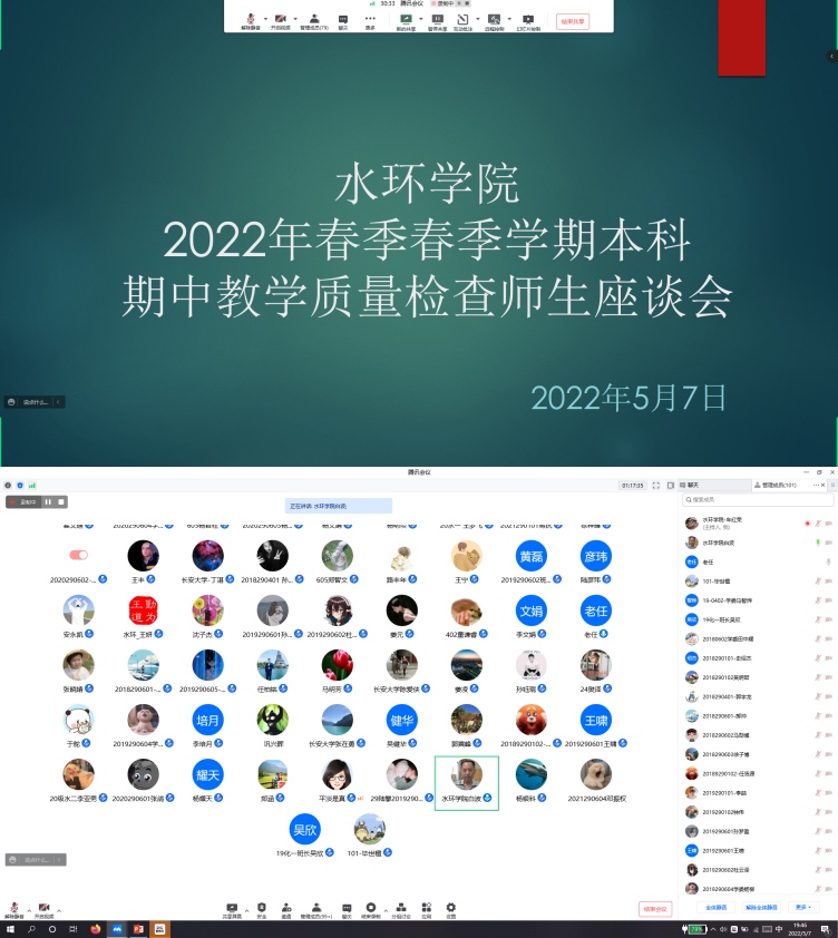 202257日晚7点到8点,学院本科期中教学质量检查师生座谈会通过腾讯会议举行。学院领导、本科教学督导、各系主任、实验中心主任、教师代表、辅导员、学院教务人员、各班级学生代表等共100余位师生参加了座谈会。