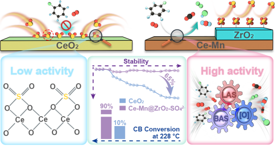 挥发性有机化合物(VOCs)是形成光化学烟雾和细颗粒物最关键的前体之一,其中,含氯挥发性有机化合物(Cl-VOCs)因具有环境持久性和高毒性,严重危害人体健康和大气环境。将有害的Cl-VOCs降解为无毒的CO2H2O和可溶性HCl具有非常重要的意义。催化降解技术因具有多组分普适性,高矿化率被公认为降解低浓度Cl-VOCs最有效的技术之一。催化降解技术虽能将其转化为无害物质,却面临氯/硫中毒及水汽干扰等挑战。当前研究通过酸处理增强催化剂布朗斯特酸性位(BAS)以促进C-Cl键断裂,但会削弱路易斯酸位(LAS)导致矿化不彻底;而金属掺杂强化LAS虽提升氧化能力,却因BAS不足产生氯化副产物。基于此,本文设计的多功能Ce-Mn@ZrO2-SO42-催化剂通过三重协同机制突破瓶颈:1)表面SO42-基团作为BAS促进氯苯C-Cl键解离,同时通过空间位阻效应和静电排斥作用抑制SO2吸附;2Ce-O-Mn结构加速电子转移,增强LAS酸性与还原能力,驱动脱氯中间体深度矿化;3)丰富的氧空位协同BAS激活气相氧并加速Cl自由基脱附。实验表明,该催化剂在含100 ppm SO2环境下仍保持高效氯苯降解性能,氯化/硫酸化副产物显著减少。该研究为开发兼具高活性、抗硫性与选择性的非贵金属催化剂提供了创新策略,对工业CVOCs深度净化具有重要应用价值。
