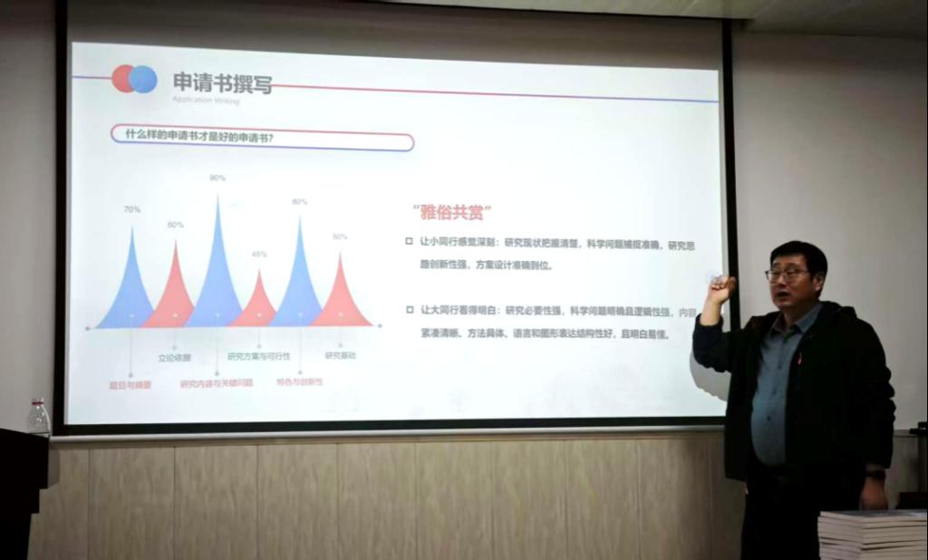 首先,副院长张洪波围绕国家基金申报报告撰写开展专题辅导。他结合自身评审与指导经验,从选题方向、框架设计、创新点提炼、论证逻辑等关键环节,以实例剖析申报常见问题,给出实操解决方案,强调申报报告需紧扣国家战略、贴合学科前沿,为支部党员教师提升申报成功率提供了精准指导。