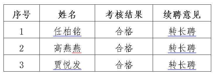 新进教学科研类人员准聘-长聘管理办法》(长大党〔2022〕84号)文件精神,学校组织开展了2023年第二批准聘制教学科研类人员聘期考核工作。经个人总结、材料审核、学院考核并提出考核结果建议、学校审核,现将学院新进教学科研类人员聘期考核结果及续聘意见(2023年第二批)公示如下: