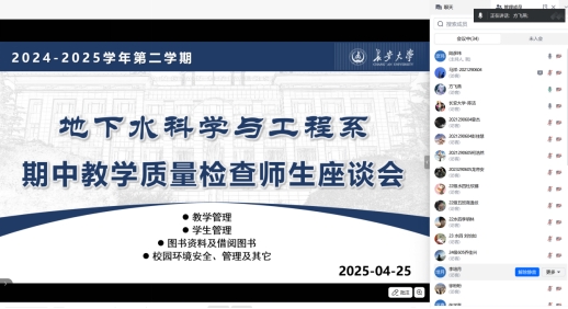 地下水科学与工程系于4月25日通过线上会议形式召开了2024-2025学年第二学期期中教学质量检查师生座谈会。学院副院长李培月、地下水系主任陈洁、地下水系教师代表及本科四个年级的学生代表共计30余人参加本次会议。会议由地下水系副主任陆彦玮主持。